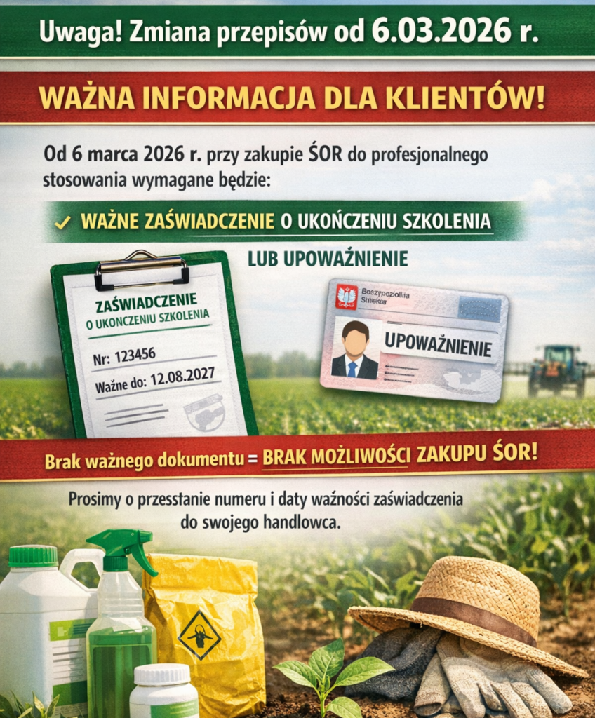 . Prosimy o przesłanie numeru i daty ważności zaświadczenia do swojego handlowca, abyśmy mogli zaktualizować dane. Bez tego dokumentu zakup środków ochrony roślin nie będzie możliwy.